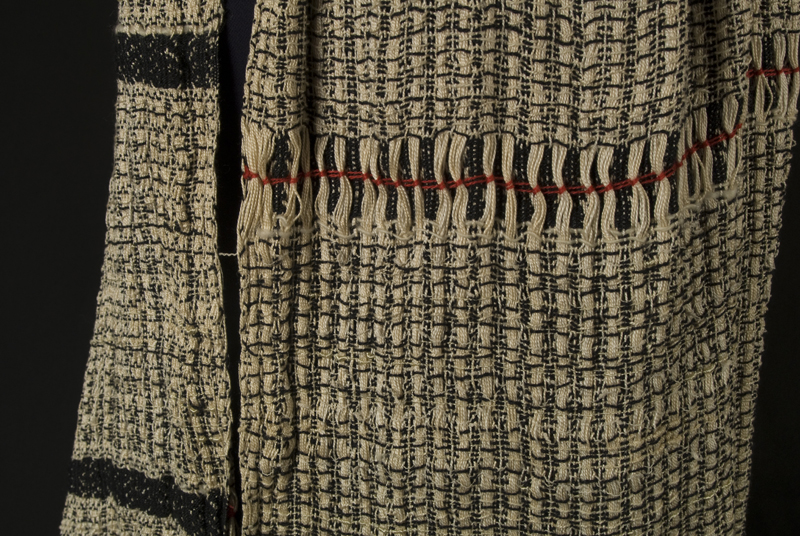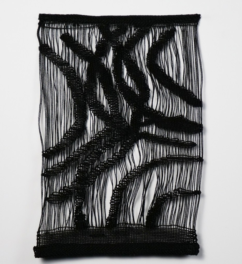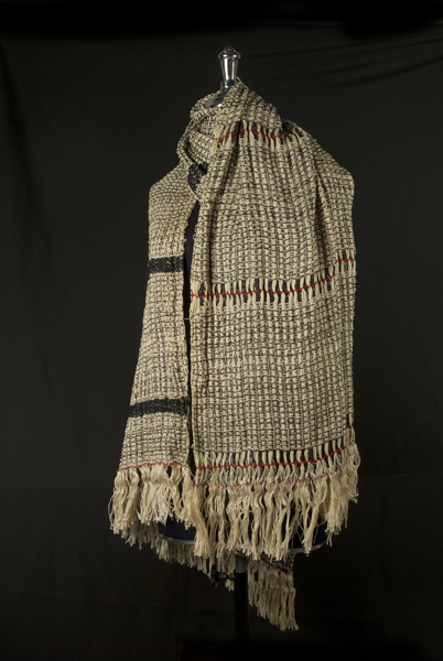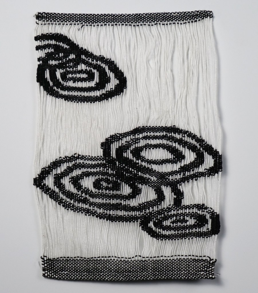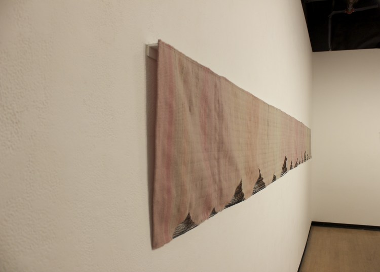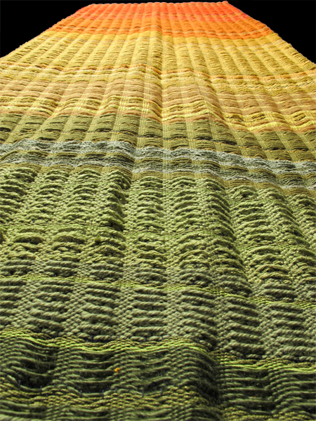 The weaving patterns were adapted from guitar tab sheet music. Each song is repeated three times and each chord is represented by a different color yarn.